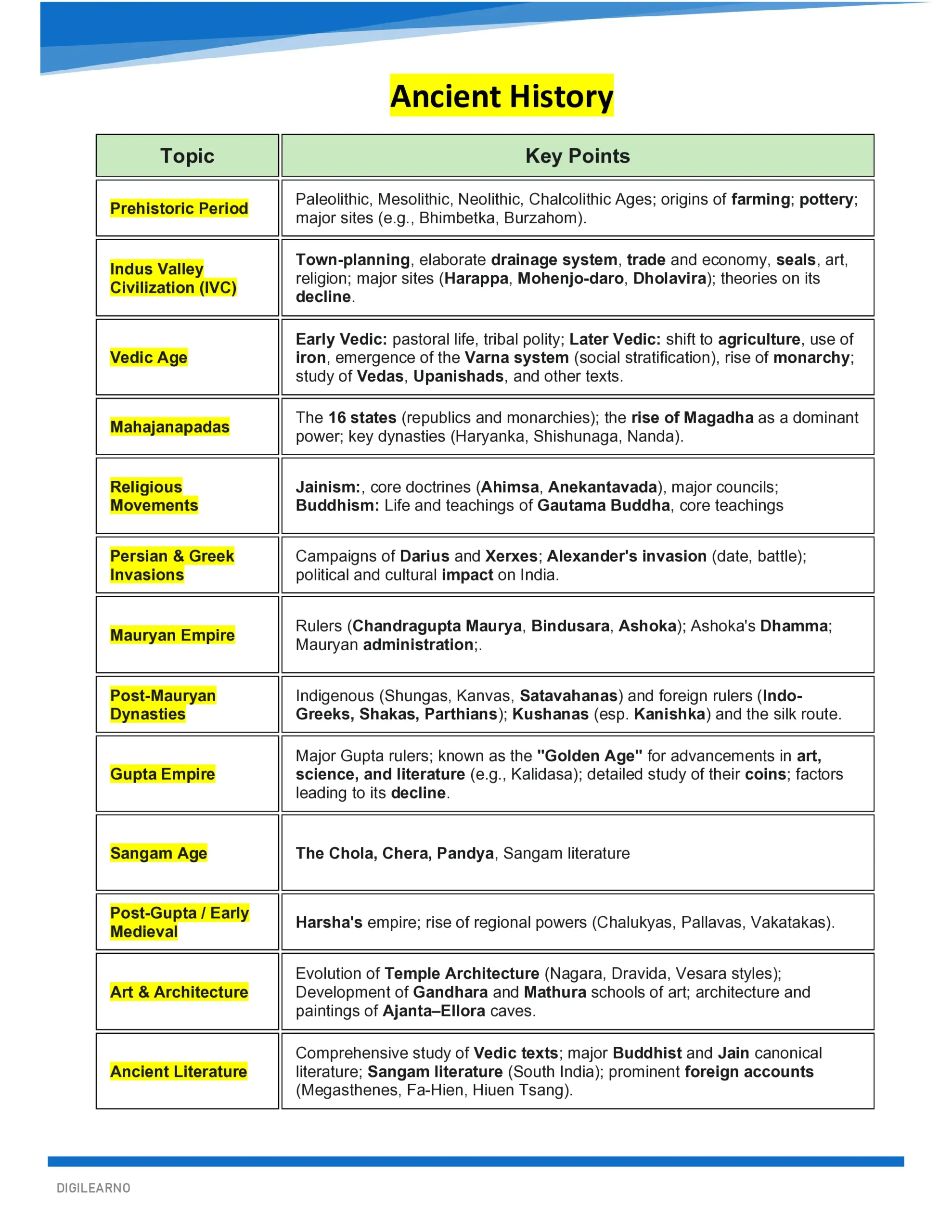 ✅ Clear explanations of Indus Valley, Vedic Period, Mahajanapadas, Buddhism, Jainism, Mauryan Empire, Gupta Age, Post-Gupta India, Sangam Age.