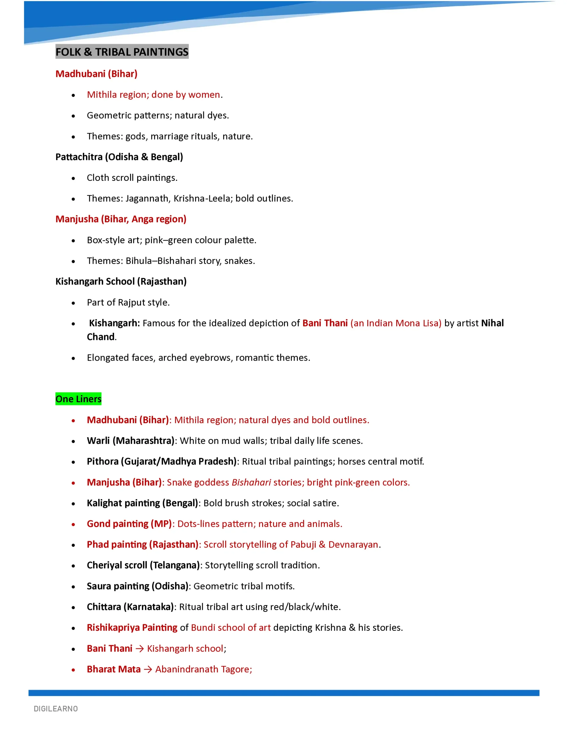 ✅ One-liner fact sheets for MCQs (dance forms, musical instruments, art schools, important festivals, heritage sites)